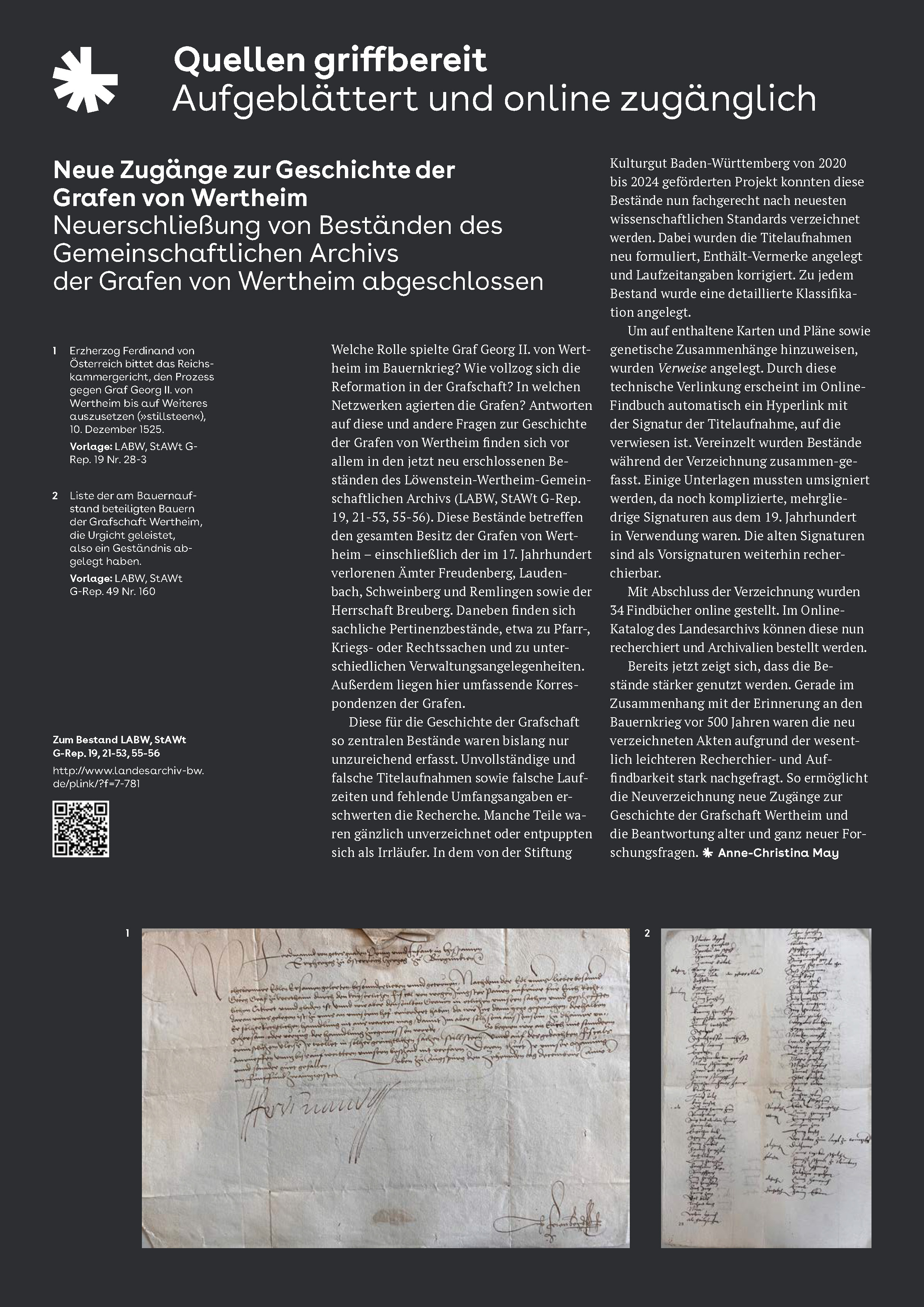 Neuerschließung von Beständen des Gemeinschaftlichen Archivs der Grafen von Wertheim abgeschlossen