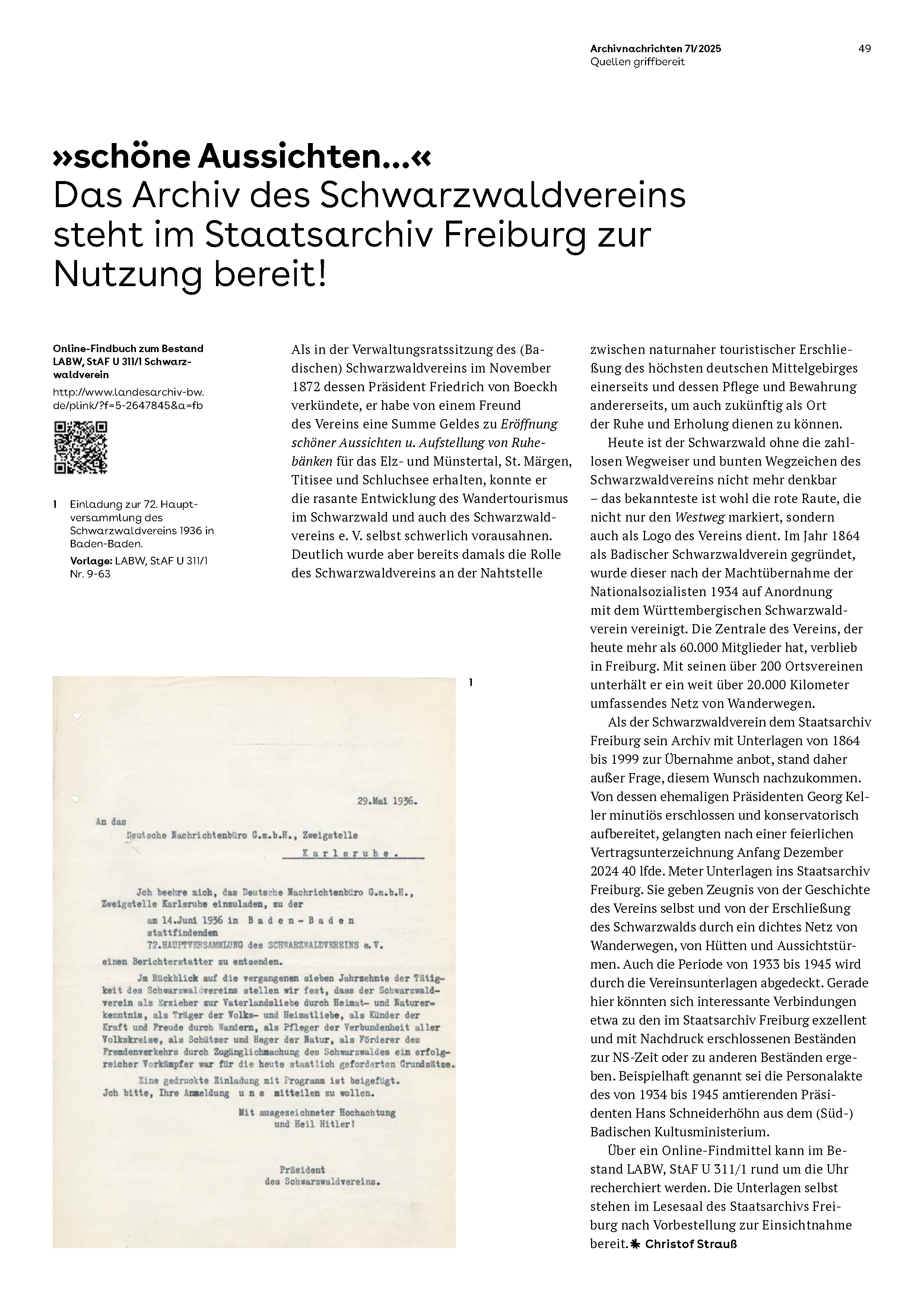 Das Archiv des Schwarzwaldvereins steht im Staatsarchiv Freiburg zur Nutzung bereit!
