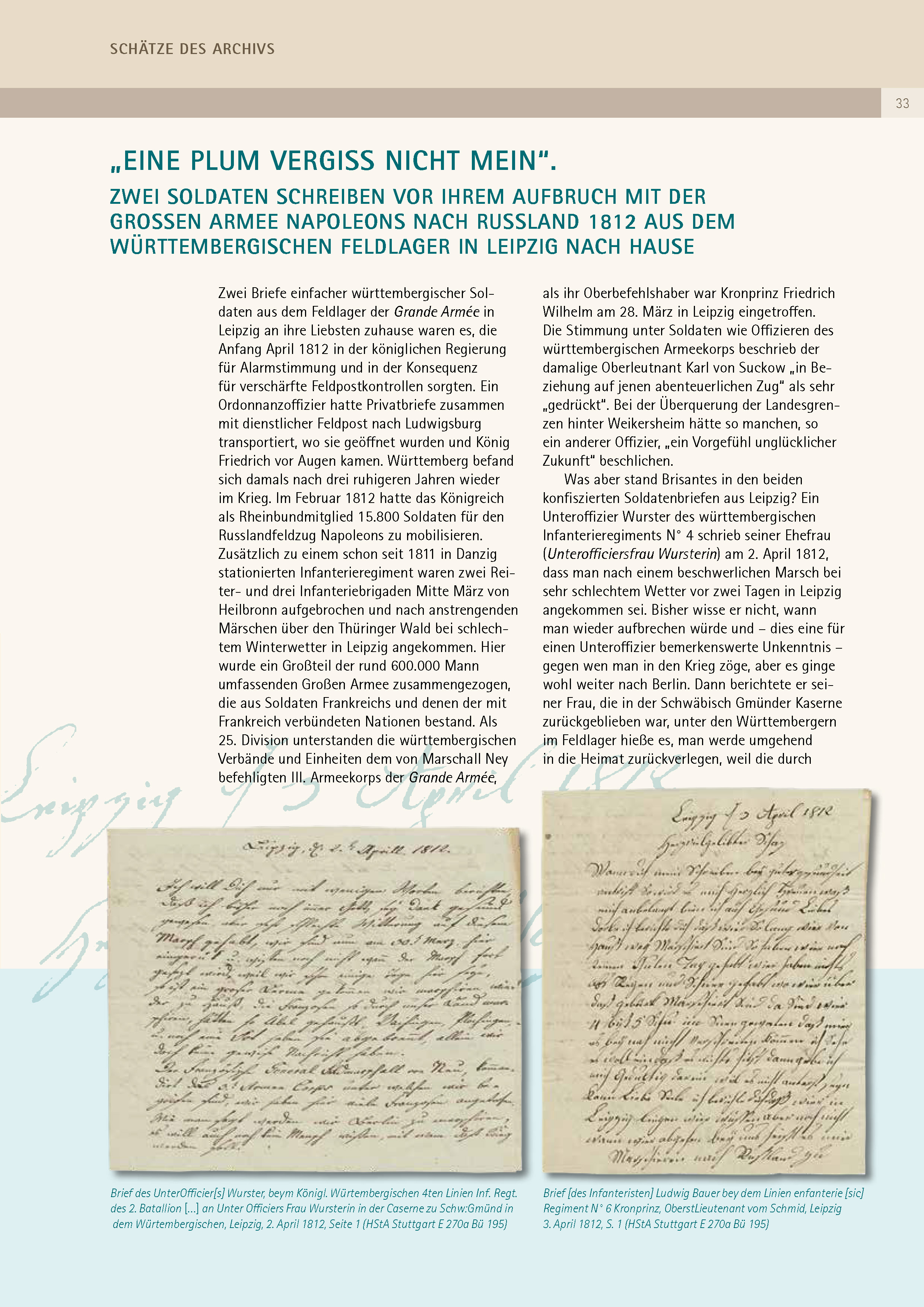 Zwei Soldaten schreiben vor ihrem Aufbruch mit der großen Armee Napoleons nach Russland 1812 aus dem württembergischen Feldlager in Leipzig nach Hause