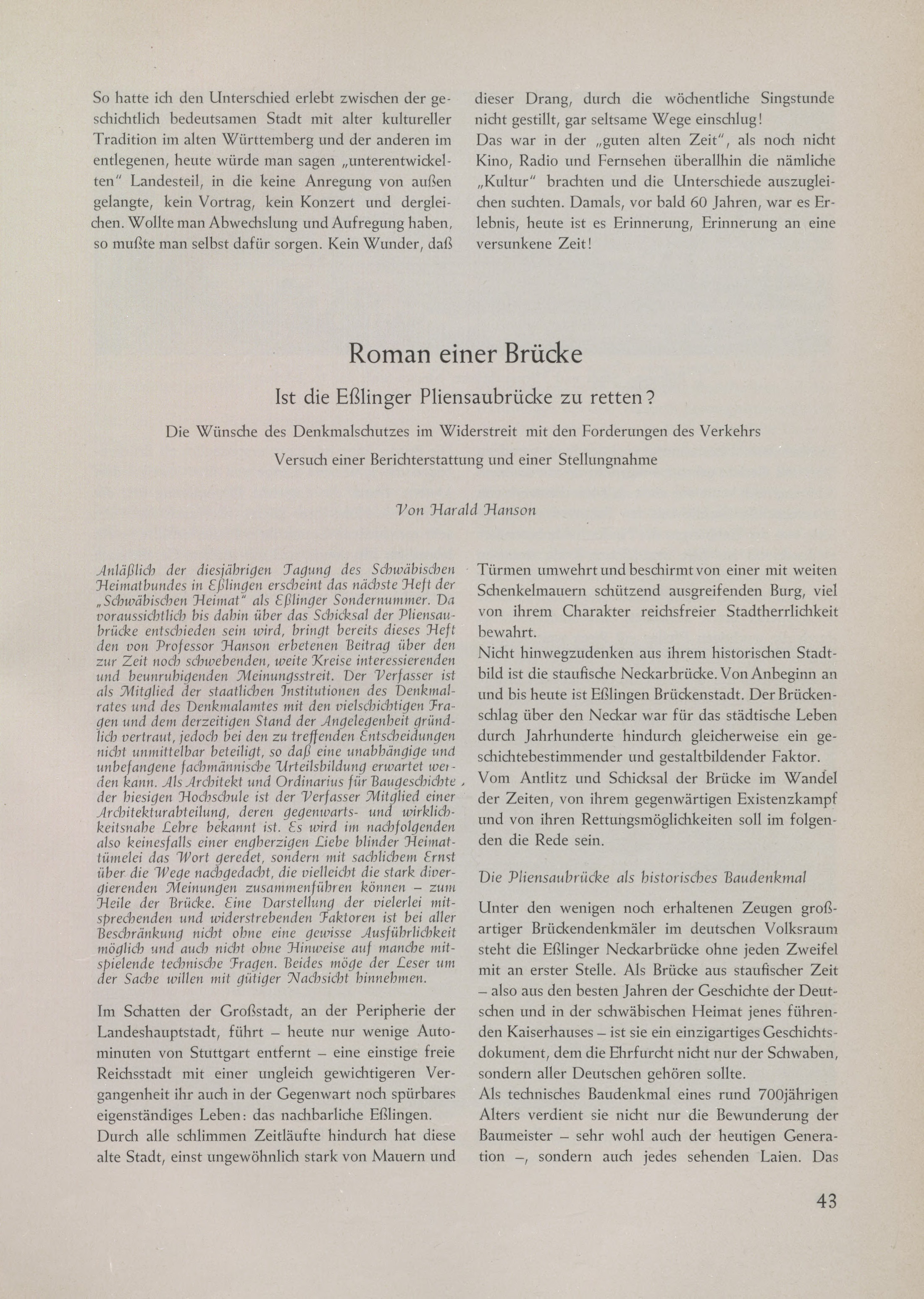 Ist die Eßlinger Pliensaubrücke zu retten? Die Wünsche des Denkmalschutzes im Widerstreit mit den Forderungen des Verkehrs; Versuch einer Berichterstattung und einer Stellungnahme