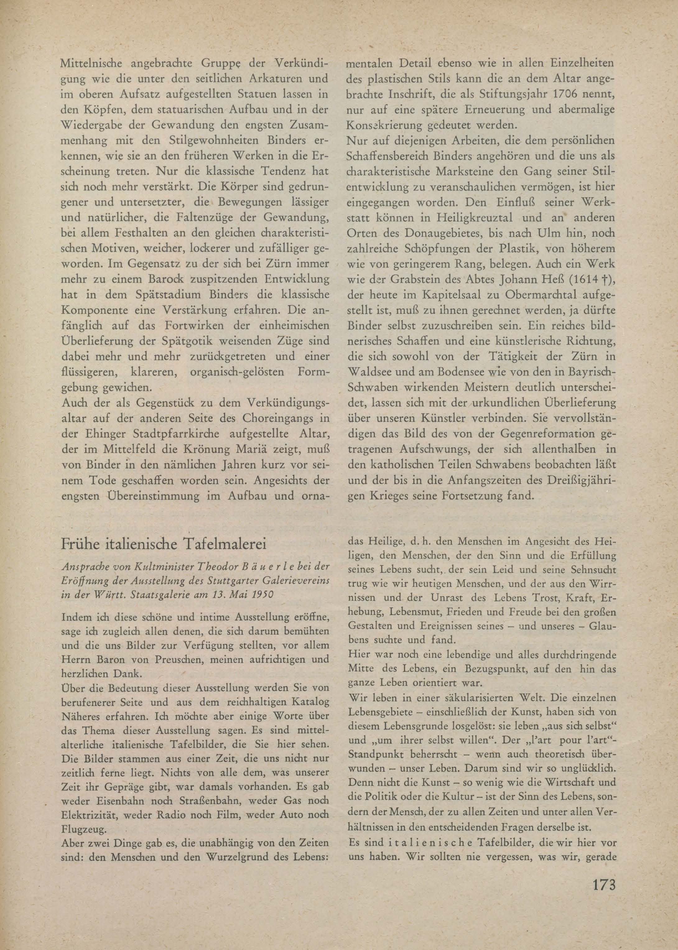 Ansprache von Kultminister Theodor Bäuerle bei der Eröffnung der Ausstellung des Stuttgarter Galerievereins in der Württ. Staatsgalerie am 13. Mai 1930