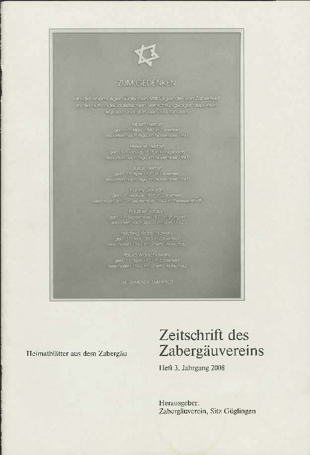 Schönfeld, W. (2008). Das tragische Schicksal der jüdischen Familie Wolf Jordan aus Zaberfeld. Zeitschrift Des Zabergäuvereins, 3, 1-5. https://doi.org/10.53458/a19mzp67